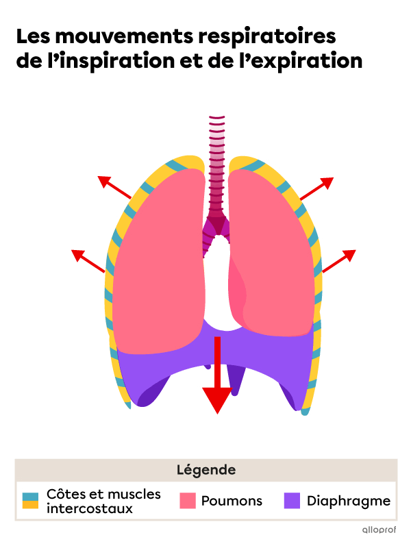 Lors de l’inspiration, le diaphragme se contracte et provoque une dépression dans la cavité thoracique permettant l’arrivée de l’air dans les poumons. La contraction des muscles intercostaux externes entraine le soulèvement des côtes et du sternum augmentant ainsi le volume de la cage thoracique.